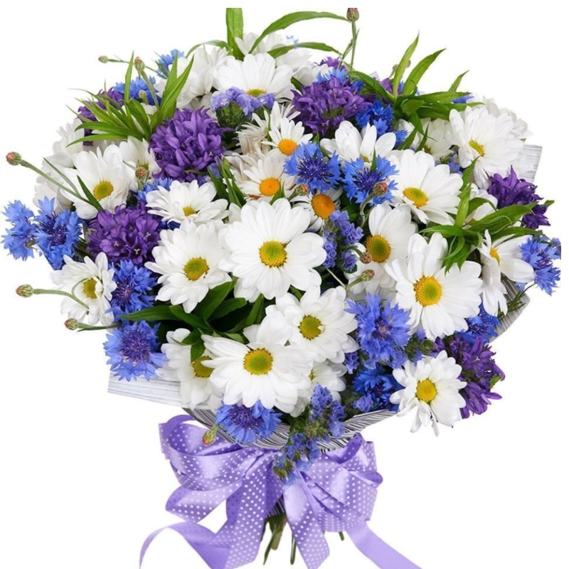 Букет состоит из 7 веток белых хризантем, 19 васильки, зелень, красивая упаковка, атласная лента.
